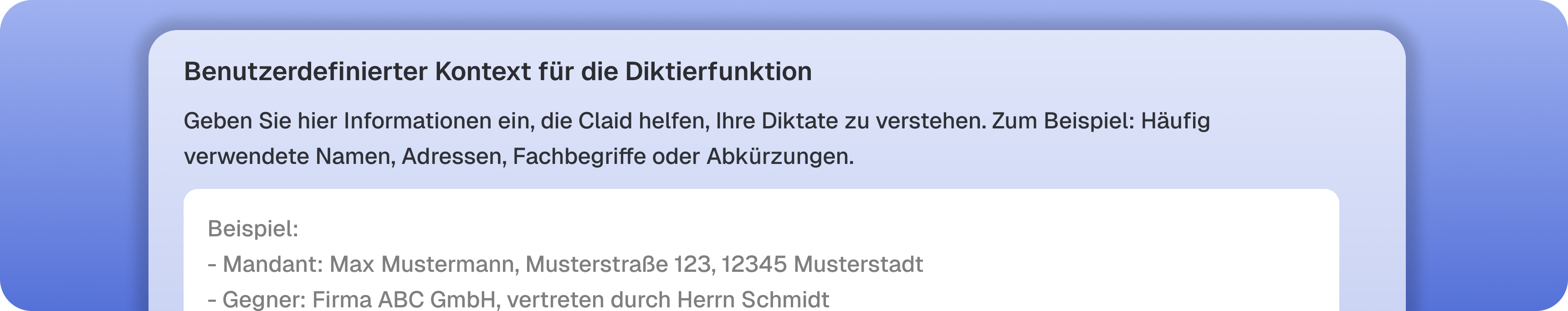 Diktieren Sie dort, wo Sie arbeiten – in Word, E-Mail, Browser und Fachsoftware. Claid Dictate ist für den Kanzleialltag konzipiert und setzt auf Zuverlässigkeit, Tempo und Vertraulichkeit.